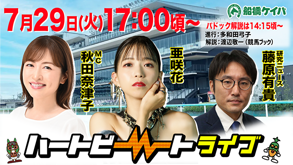 冗談を書けるレベルに余裕が出てきたのはいい傾向。今度は個人的な[お知らせ]を。次週、火曜日に船橋ケイバ ハートビートライブに解説として出演いたします。MCは我等が秋田奈津子さん、ゲストははじめましての亜咲花さん。競馬好き、馬券好き必見の濃い~配信になりそうです。前開催も解説を担当しましたが、いつもよりパドック推奨馬が馬券に絡んでいた印象。やはり暑い時期でもあり、活気、元気があって良く見える馬が狙い目になると実感。今回は迷ったらパドック推奨馬のボックス買いなども活用し、的中を目指したいところ。スタジオからの配信は29日17時頃にスタート予定です。是非、お仕事終わりに船橋ケイバを一緒に楽しみましょう。