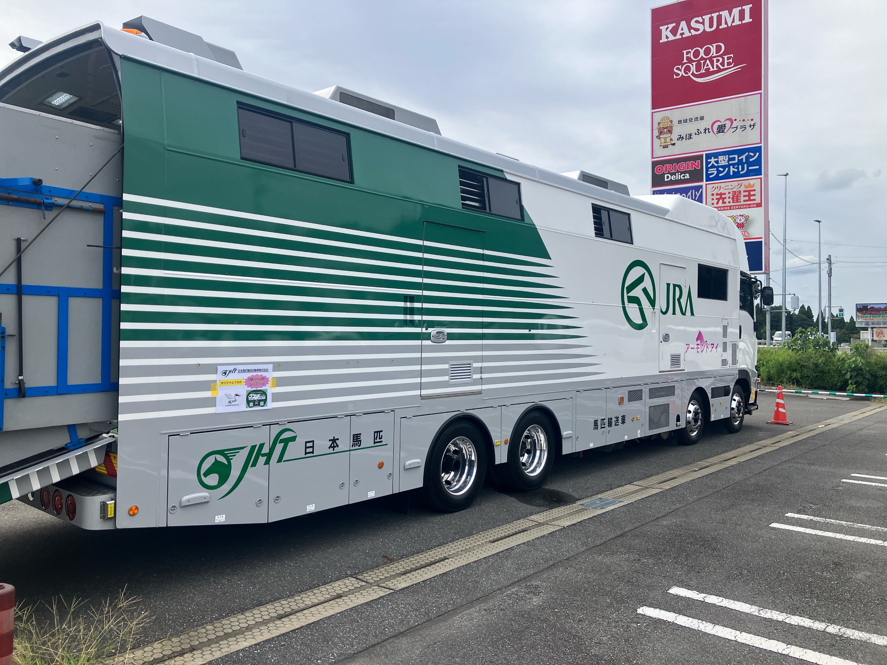 ▲ふれ愛プラザがあるスーパーの駐車場では馬運車が展示されていた(アーモンドアイ号)