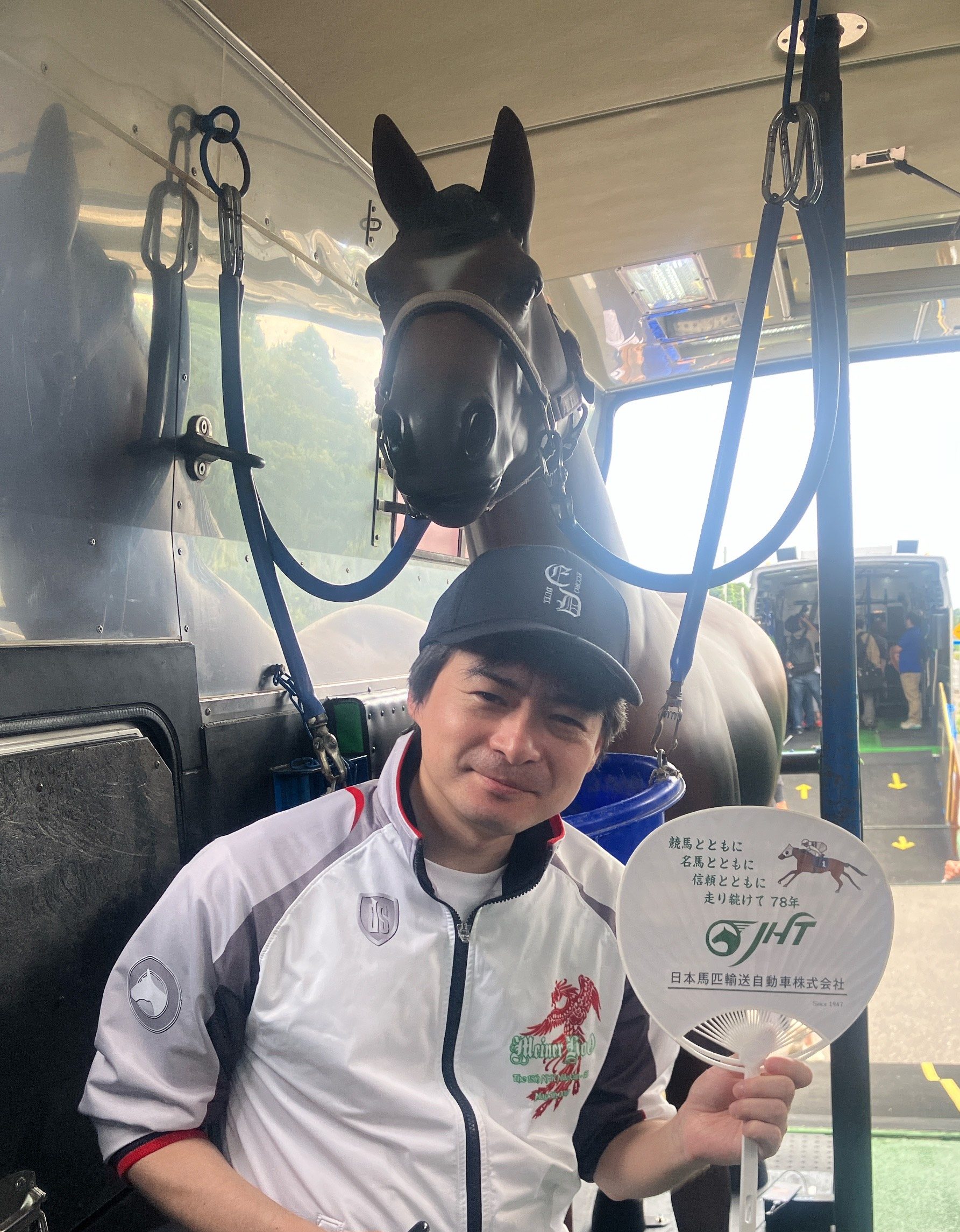 ▲見学させてもらった馬運車の中でポーズを取る競馬ブックYさん