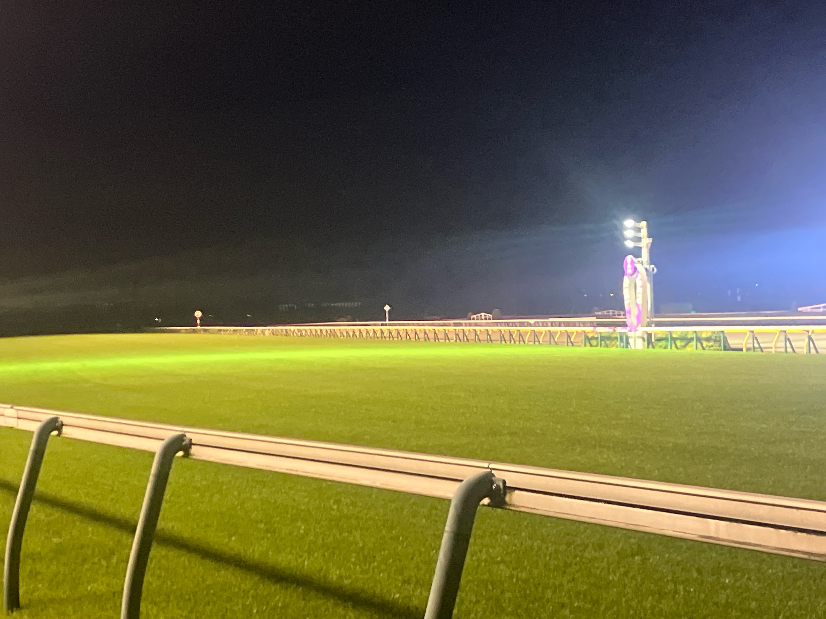 照明に照らされて青々と輝く芝コースを見ていると何だか不思議な気分に。地方競馬場のナイター開催に足繁く通っているのだが、また違った良さがあった。