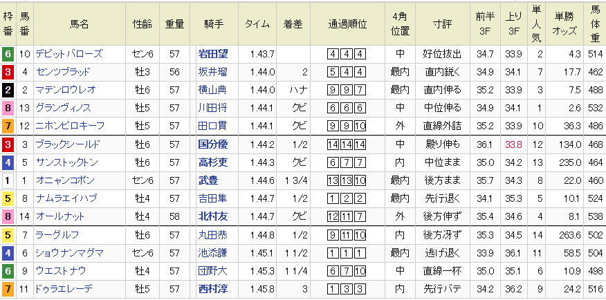 2012年からはずっと6月に開催されていたが、再び12月開催へ。レースはテン3ハロン33秒9、1000m通過が57秒1。前で運んだ3頭は⑫⑨⑭着に終わった。開幕週でもかなり速いペースだが、先頭から離れた4番手以降は速めの平均ペースぐらい。勝ったデビットバローズは4番手から。タテ長の隊列でコースロスなく運ぶことができたし、直線もスムーズに外へ。楽な手応えから1ハロン標手前で仕掛けられると鋭く反応して抜け出した。「ゲートを決めることだけを意識して乗りました。先行集団の後ろでリズムを崩さず行けました。これで負けたら仕方がないという形で追い出し、強い勝ち方でした」と岩田望来騎手。ベストと言える阪神1800mで重賞初制覇。