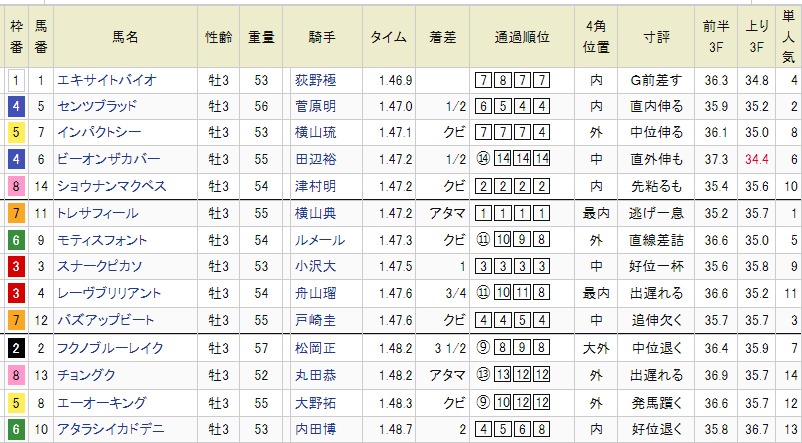 【展開・ペース】 外からトレサフィールが出脚の速さを生かしてハナを奪いました。ショウナンマクベスが掛かり気味に2番手を進み、スナークピカソはインの3番手に収まって追走。中盤、ラップが多少緩んだものの、平均ペースで推移。開幕週の馬場だけに上位争いを演じたのは先行した組と内をロスなく運んだ馬でした。