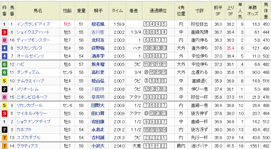 シェイクユアハートは序盤こそ周りの様子を伺いながらだったが、向正面に入ると外に出し、3角からジワジワと進出。4角で先頭に取り付き、直線で一旦は先頭。ただ、最後は内から勝ち馬に抜け出される。「小回りコースでもあるので、意識して少し早めに動きました。最後、勝ち馬に一瞬にして抜け出されましたが、他の馬は凌いでくれましたからね」と古川騎手。勝ち馬とは回ったところと4㎏のハンデ差もあったはず。ディープモンスターは大外枠だったが、外枠で掲示板に載ったのはこの馬だけ。地力もあるし、タテ長の展開でうまく内に入れられたのも良かった。勝負所は勝ち馬の後ろをついていき、直線で更に内へ。「勝負どころで勝ち馬と同じ位置にいながら手応えで見劣ったのは、斤量差の分もあったと思います」とは北村友一騎手。1番人気のメリオーレムは⑨着。道中はタテ長の後方。行きっぷりがひと息だったし、勝負どころの反応も悪かった。川田騎手は「ずっと苦しそうな走りでした。暑さにやられてるとしか思えないです」と敗戦の弁。