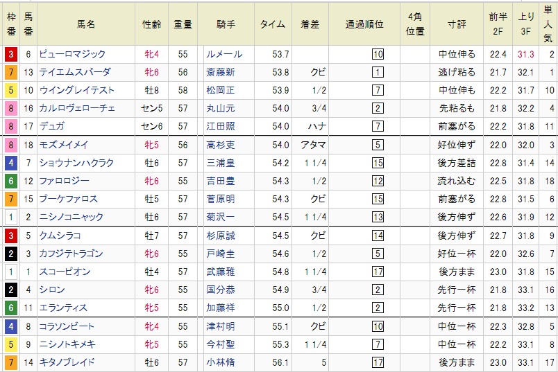 テイエムスパーダ(1番人気)は年齢的に気合を表に出さなくなってきましたが、動きには柔らかみがあって仕上がりは良かったですね。抜群のダッシュ力を生かして前へ。カルロヴェローチェとの競り合いを制して勝ちパターンに持ち込めたのですが、今回は勝ち馬の決め手が一枚上でした。ウイングレイテスト(10番人気)は高齢でも体は若々しく、脚取りはしっ