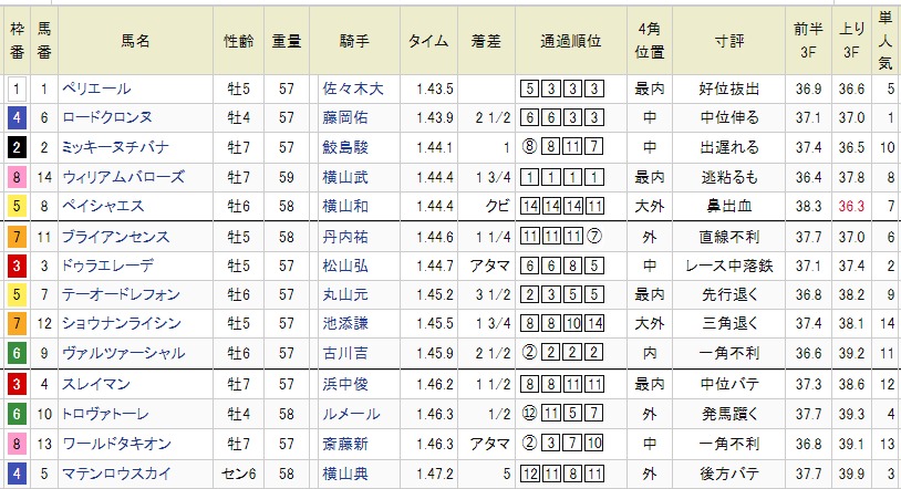④着ウィリアムバローズ(8番人気)は自分の形に持ち込めたものの、枠順と斤量も影響して序盤に脚を使っており、内容的には上々。先行力がモノを言う設定になれば、巻き返しは必至でしょう。当レースの連覇を目指したペイシャエスは(7番人気)は⑤着。体重増による緩さ、脚捌きの硬さを感じた鞍上が末脚勝負を選択したようで、追い上げてきた際には勢いもありましたが、ゴール前で脚勢が鈍ったのはレース後に発表された鼻出血の影響もあったのでしょうか。⑥着のブライアンセンス(6番人気)は直線での不利、勝ち馬の後ろからロスなく運んで伸び切れなかった⑦着ドゥラエレーデ(2番人気)は発馬直後に落鉄を鞍上が敗因に挙げており、こちらも力負けではありませんね。また、自分が◎にしていた⑭着マテンロウスカイ(3番人気)はスタートが今ひとつでレースの流れに乗れず、向正面で追い上げを図ったときも脚が続きませんでした。6歳馬の休み明けで状態が今ひとつだったのか、小回りの1700mは勝手が違ったのか、大敗を喫した要因は、はっきりとは分かりませんが、マーチS②着の内容からダート適性が高いことは確かですし、次走も簡単には評価を下げない方がいいと考えています