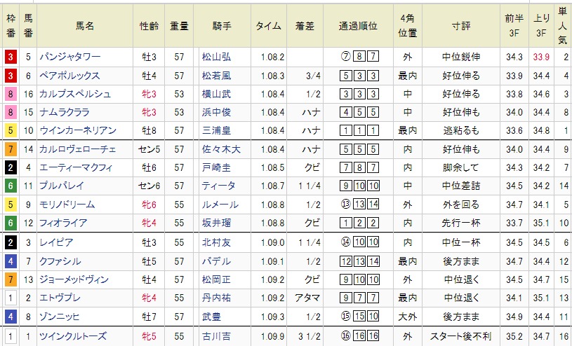 【レース分析】 勝ったパンジャタワー(2番人気)はNHKマイルCから8キロ増の体重でも若干、余裕がある程度。スタートで出負けしましたが、すぐに二の脚で挽回し、道中は中団の外めで動きやすいポジションに。勝負どころから追い上げて行く時も手応えは十分で、直線の入り口から本格的に追われると力強く伸びて、前、内の馬たちを一気に呑み込みました。