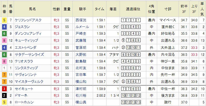 9月7日(日曜)に中山競馬場で行われた第10回GⅡ紫苑S(芝2000m・3歳牝馬・馬齢重量・晴れ・良馬場)は7番人気だったケリフレッドアスクが優勝。管理する栗東・藤原英昭調教師、騎乗した西塚洸二騎手とも当レースは初勝利となった。この結果、ケリフレッドアスク、ジョスラン、ダノンフェアレディの3頭が秋華賞の優先出走権を獲得した。ケリフレッドアスクは北海道平取町ASK STUDの生産馬。馬主は廣崎利洋さん。