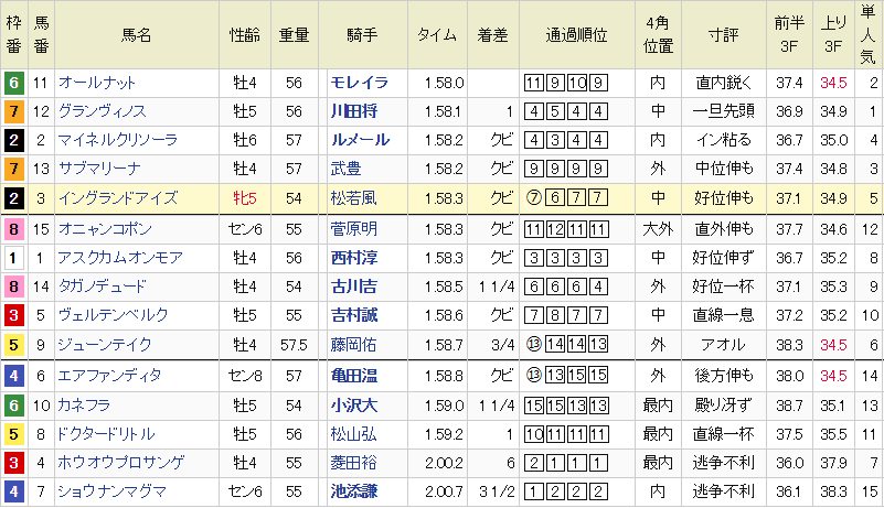 グランヴィノスは外から勝ちに動いて直線の叩き合いで一旦は先頭に立つ場面。勝ち馬の決め手に屈したとはいえ、強い競馬をしているし、重賞にも十分メドが立った。マイネルクリソーラは内でロスのない立ち回り。直線で外にいた勝ち馬には一気に離されたが、渋太く脚を使っている。久々の2000mでもうまく流れに乗れたし、叩き良化傾向であることを考えると健闘。勝ったのはオールナット。スタートしてからラチ沿いに入れて、道中は中団の後ろからじっくりと。4角では1つポジションを上げてマイネルクリソーラの後ろ。直線入り口でその外に出し、1ハロン標手前でアスクカムオンモアの内へ。坂で更に加速して最後は1馬身差をつける完勝。馬は当然としてジョッキーの好騎乗が光るレースだった。