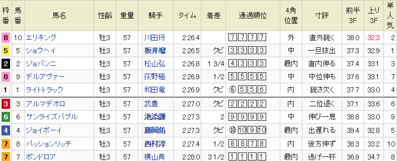 前半62秒6─後半57秒7で2分26秒4。3ハロン標まで隊列に変化はなく、超スローペースからの瞬発力勝負。春のクラシックを好走した上位人気が順当に来たが、その中でも適性の差が出た感じ。エリキングはレース最速の上がり32秒3を使って外から差し切り。適性があったとはいえ、完勝と言える。「次のことを考えてゆっくりとリズムを大事に競馬をしました。現状の造りでこれほど動けるのか、というぐらい動けています。あとは無事に次に向かえたらと思います」と川田騎手。本番の菊花賞に向けて手応えを掴んだ様子。