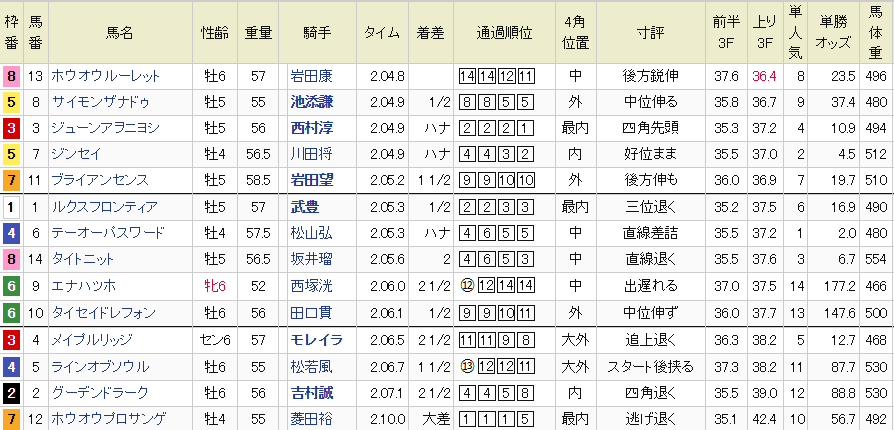 「自分の競馬に徹しました」と菱田騎手がコメントした外枠のホウオウプロサンゲがハナを奪うまでに時間がかかったが、序盤の入りは35秒1と速め。そこから13秒台のラップが続く中緩み。3ハロン標でジューンアヲニヨシが先頭に並びかけて、12秒2─12秒1と一気にペースアップ。結果、最後は後ろの組の競馬になった。勝ったホウオウルーレットはいつも通り後方から。1角までに内に入れて、向正面でペースが緩むとギュッと馬群が縮んで前と差が詰まった。そのまま内を回り、4角で外めへ誘導。直線に向いてもスペースはできていたし、グイグイと脚を伸ばして、最後はサイモンザナドゥの外からゴールで半馬身前に出た。「ずっと乗せていただき、やっと重賞を勝つことができて良かった。この勝利でもっともっと飛躍できれば」と岩田康誠騎手。
