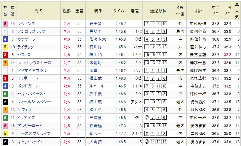 10月12日(日曜)に東京競馬場で行われた第1回GⅡアイルランドトロフィー(芝1800m・3歳以上・牝馬・別定・曇り・良馬場)はラヴァンダ(4番人気)が優勝。管理する栗東・中村直也調教師、騎乗した岩田望来騎手ともにアイルランドトロフィーは初勝利。ラヴァンダは北海道新冠町森永聡さんの生産馬。馬主は森永聡さん。