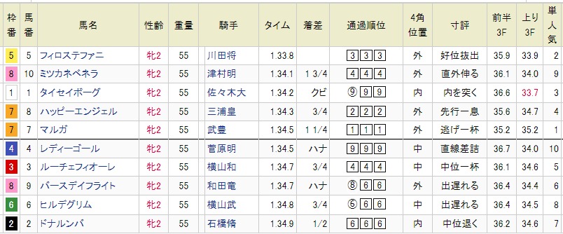 【展開・ペース】 戦前に想定した通り、マルガがハナを奪取。これにハッピーエンジェルが続き、平均ペースでレースは進みました。