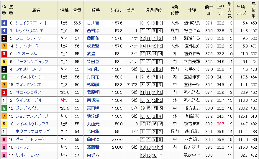 前半60秒3─後半57秒3の後傾ラップ。ただ、2番手につけたピースワンデュックがかなり強気な競馬をしたことで、逃げたホウオウプロサンゲ、追いかけた7枠の2頭は苦しくなった。結果的にその後ろにいた差し馬勢の決着に。シェイクユアハートはこれが重賞初制覇。スタート後、周りを見ながらタテ長の隊列の中団に収まり、向正面で外めに進路を取って機を窺う。4角の手応えは十分。直線に入ると前を行くジューンテイクを目標に脚を伸ばし、最後は内のレッドバリエンテを交わして先頭でゴールを駆け抜けた。「早めに動いてくる馬がいると思っていましたし、いつも通りにしっかりと伸びて勝つことができて良かったです」と古川吉騎手。ずっとコンビを組んできた相棒との重賞勝ち。嬉しさも一入だろう。