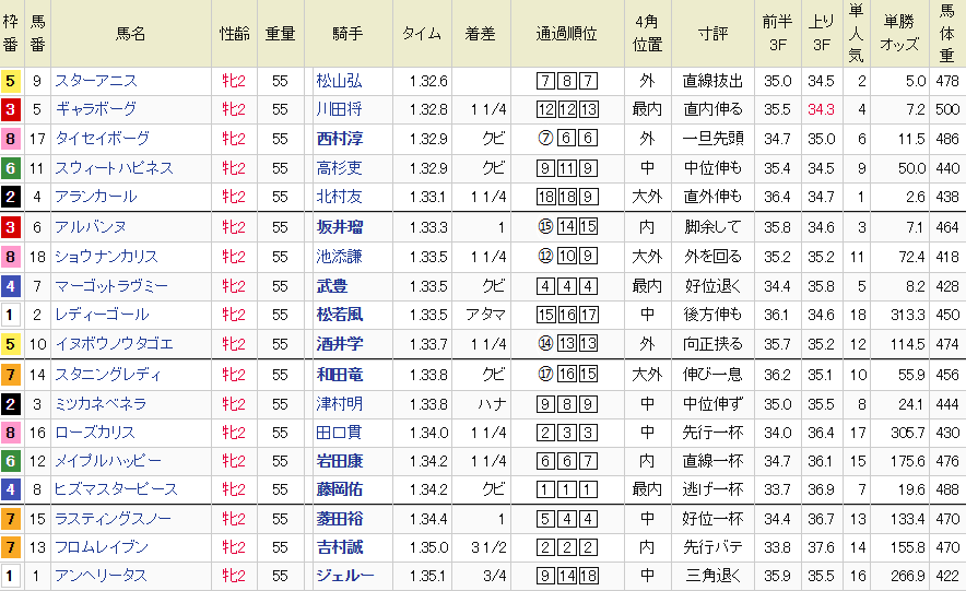 ヒズマスターピースにフロムレイブンが絡んでいく形で、前半33秒7─後半35秒3のハイペース。差し追い込みの決着になった。勝ったのは2番人気のスターアニス。スタートで外にヨレて隣の馬に迷惑をかけたが、自身は中団で流れに乗れた。今回は初めての距離が心配されたが、折り合いはついていたし、外めでスムーズな立ち回りができた。残り300mあたりで追い出されると、しっかりと伸びて差し切った。「直線では追い出しを我慢できるぐらいの余裕。強かったです。とにかく、来年の春まで無事にいってほしいと思います」と松山騎手。ギャラボーグはポジション争いで後ろに引かされたが、3角でラチ沿いに入る。そのまま内を回って、直線で少しだけ外に出し、ロスのない競馬はできたが、勝ち馬の決め手が上だった。それでも未勝利戦を勝ったばかりで、この走りは先々が楽しみ。