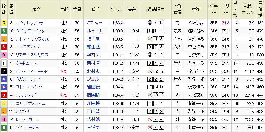 1番人気のアドマイヤクワッズはスタートひと息で、馬群から少し離れた後方。4ハロン標で集団に取り付いて、外から追い上げようとしたが、内からエコロアルバが出てきて更に外を回らされる展開。上位2頭と比べると、外から前を追いかけていった③④着はロスが大きかった。上位陣の勝負付けは済んでいないと言えるだろう。