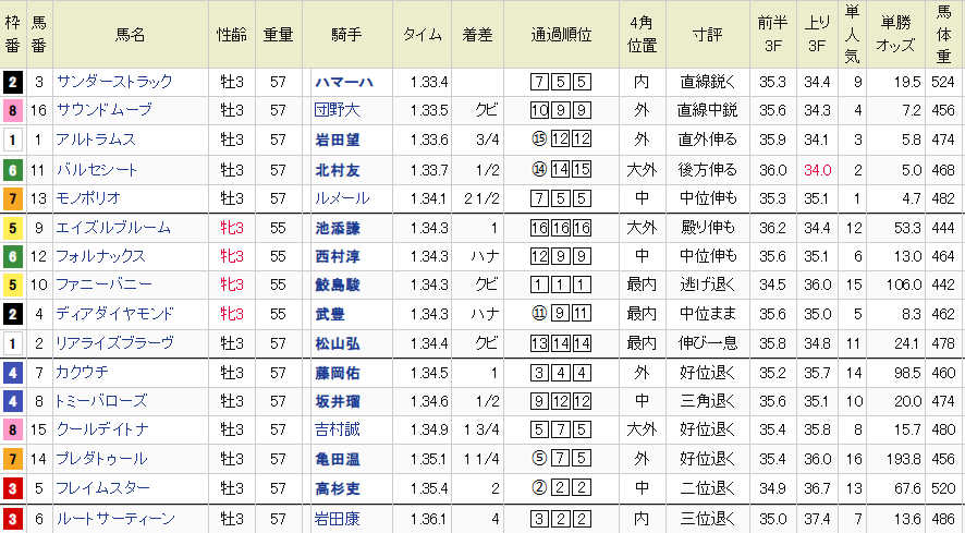 「道中でフワッとする面があり、3角の下りから思った以上に進めませんでした」とはバルセシートの北村友一騎手。向正面は促して、サウンドムーブの後ろ。以前よりは良くなっていたが、コメント通り坂の下りの進みが悪く、アルトラムスに前に入られてしまう。それでも直線は大外からレース最速上がりで一気に浮上。この馬も結果的にコース取りの差が大きかったが、ポテンシャルは高い。1番人気のモノポリオは⑤着。位置的には前述した2列目3頭の直後。直線に向いて綺麗に前が開いたし、伸びてはいるが、上位とは決め手の差。「距離は合います。追ってからの反応が遅かったし、まだ甘いですね。経験を積む毎に良くなると思います。」とルメール騎手。