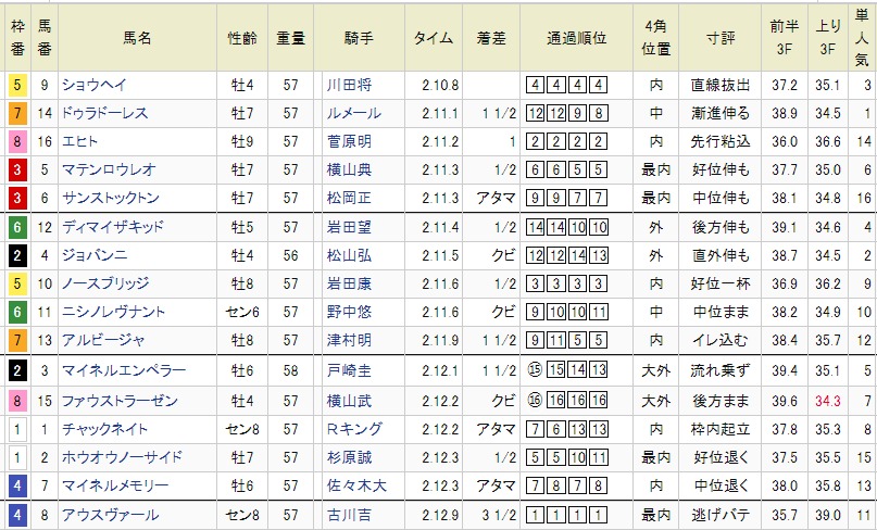【展開・ペース】 チークピーシズからブリンカーに換えて臨んだアウスヴァールが飛ばして前半1000mを58秒7で通過。ハイペースでしたが、馬群がかなり縦に長くなりましたから3、4番手を進んだノースブリッジ、ショウヘイがベストポジション。