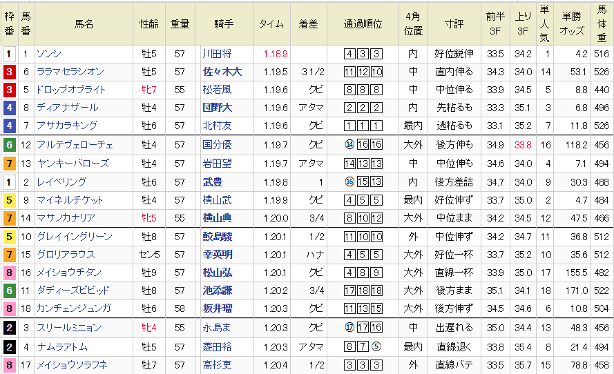 開幕週でもそこまで速い馬場ではなかったが、結果は1分18秒9のコースレコード決着。前半33秒1─後半34秒5。前半33秒1は昨年の京都開催を含めた過去10年で最も速い。外を回して差し切るには厳しい展開。掲示板に載った5頭は、位置取りは別にして、いずれも内枠で道中も内めを立ち回った馬が占めた。勝ったソンシは骨折のため約1年ぶりの実戦。プラス14㎏でやや余裕残しに映る体つき。それでもレースでは好位のインでがっちり。速い流れで折り合いもついていた。直線に向いてスムーズに前を行く2頭の外に出せたし、終わってみれば後続に3馬身半差の圧勝。きっちりと人気に応えた。「何度もレースを使おうとして諦めてというのを繰り返しながら、久しぶりに競馬を走ってこれだけの内容で走れたのは本当にびっくりで頭の下がる思いです。これからも競馬場に無事に来られれば」と川田騎手。