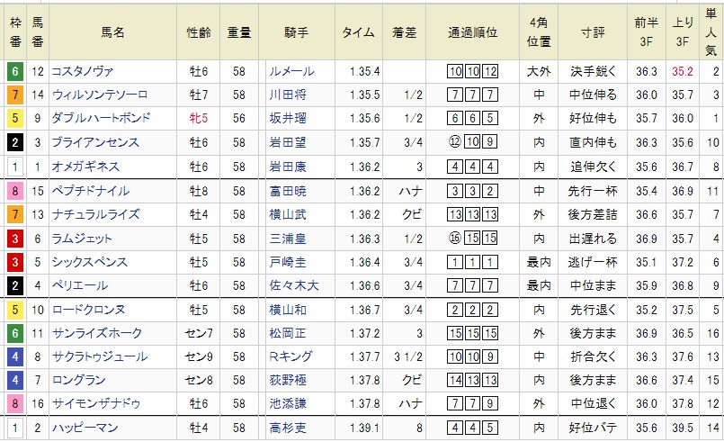 【展開・ペース】 徹底先行型が不在だった今年のフェブラリーS。スタート後、押し出されるようにしてシックスペンスがハナを切り、差がなくロードクロンヌ、ペプチドナイルが続きました。前半4ハロン通過タイムは47秒1ですから平均やや速めのペース。最後は地力勝負になりました。