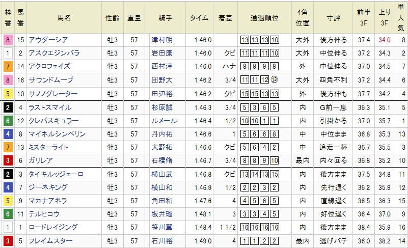 【展開・ペース】 フレイムスターが同型を制してハナを奪いましたが、途中からクレパスキュラーが捲ってきたためスタートしてから5、6ハロン目が11秒3、11秒4と一気にペースUP。差し・追い込みタイプに有利な展開となりました。