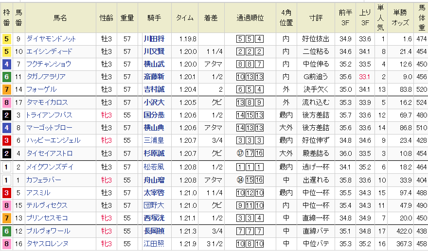 データ室の対象フクチャンショウが③着。馬連勝負だったので惜しくも外れ。道中は中団のインで勝ち馬を見ながら。いい位置だったと思う。「(ダイヤモンドノットとは)京王杯2歳Sの時の圧倒的な差を考えると、今日は追い詰められた分、かなり成長してきています」と横山武史騎手。常に相手なりに立ち回れる安定感は光る。タガノアラリアは後方から。直線で少しずつ外に出し、最後は②着馬と差のないところまで追い込んだ。「3角で狭くなるところがあって、その影響で1列下がってしまう形になってしまったのはもったいなかったです」と斎藤新騎手。前が止まらず展開は向かなかったが、1ハロン短縮でうまく脚ををためて終いを生かせた。トライアンフパスは後方のインを追走し、直線で伸びそうな手応えはあったが、馬群を捌くのに苦労していた。スムーズなら掲示板はあったかも。